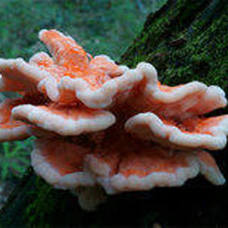 【性状介绍】子实体大型。初期瘤状,似脑髓状,菌盖覆瓦状排列,肉质多汗干后轻而脆。菌盖宽8-30cm,厚1-2cm,表面硫磺色至鲜橙色,有细绒或无,有皱纹,无环带,边缘薄而锐,波浪状至瓣裂。菌肉白色或浅黄色,管孔而硫磺色,干后褪色,孔口多角形,平均每毫米3-4个。此菌的重要特征是子实体瓦状排列,硫磺色。